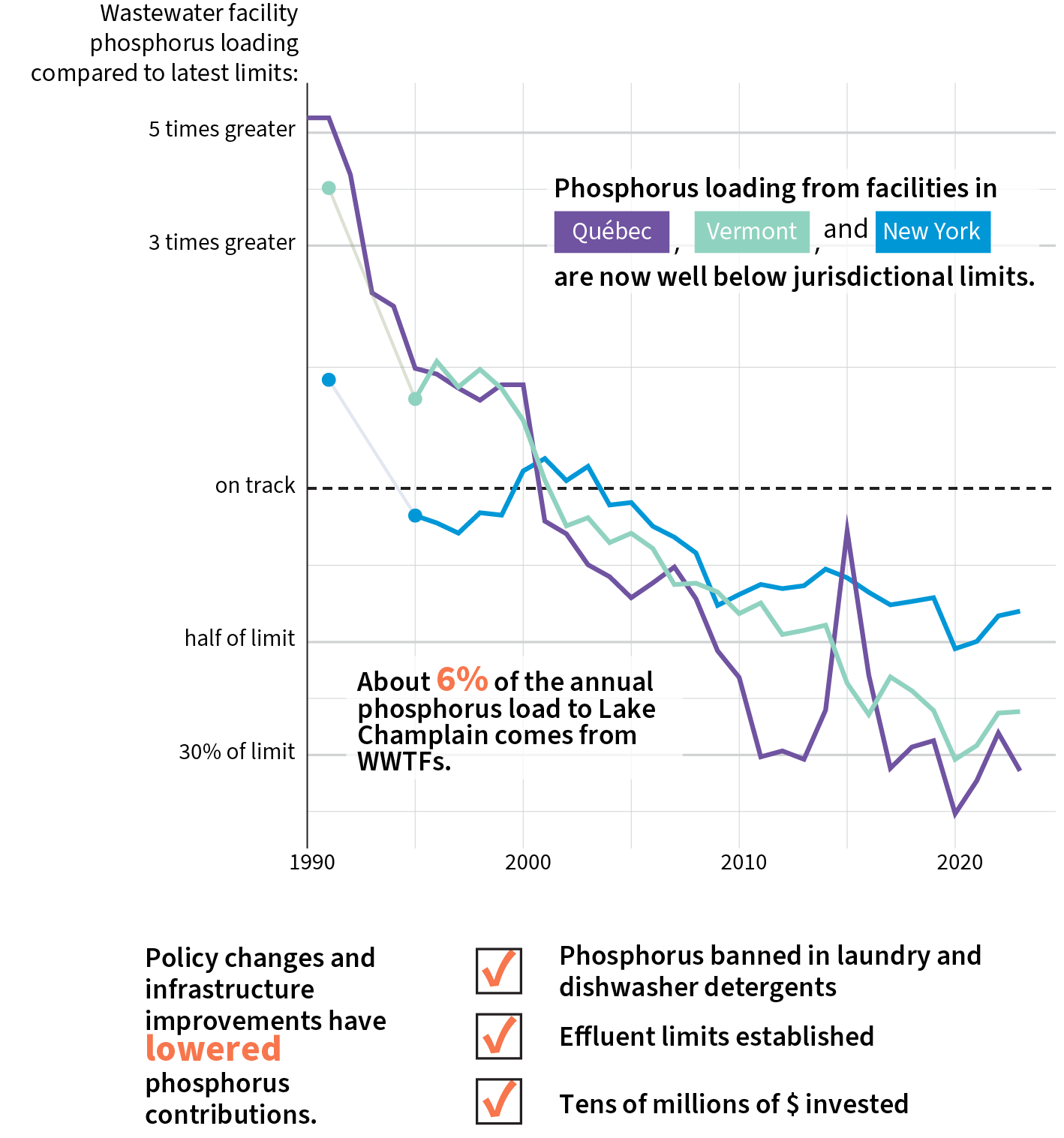 New York, Vermont, and Québec have invested significant resources to reduce the amount of phosphorus discharged by point sources in the Basin. Point sources now account for about 5% of the total amount of phosphorus entering Lake Champlain. The primary point sources of phosphorus in the Basin are 98 wastewater treatment plants: 59 in Vermont, 30 in New York, and 9 in Québec. Several industries and state facilities (such as fish hatcheries) also discharge phosphorus to Lake Champlain or its tributaries.